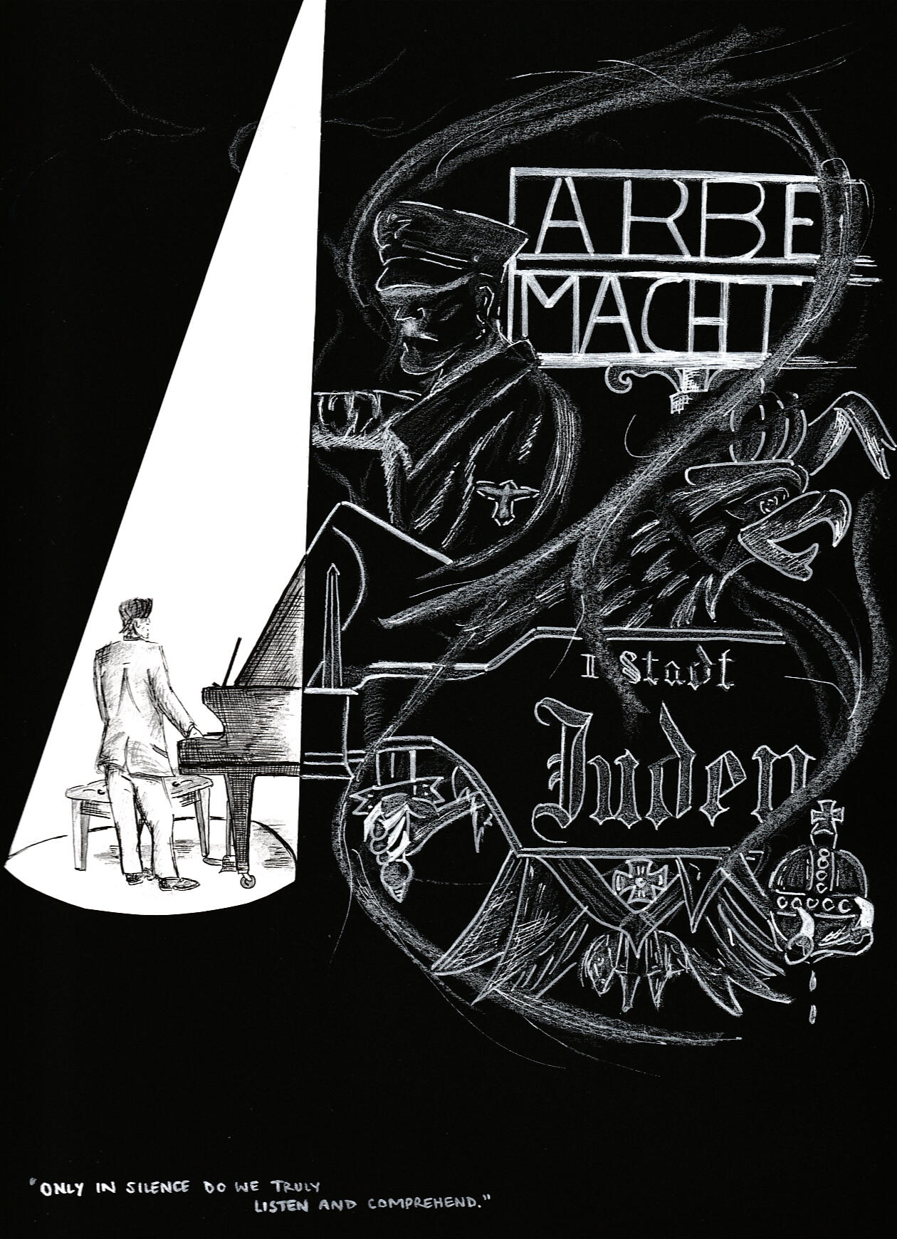The power of music vs. the weight of history. warring inversions of light and shadow. Crooked spotlights and looming shadows; over a city, over a person...