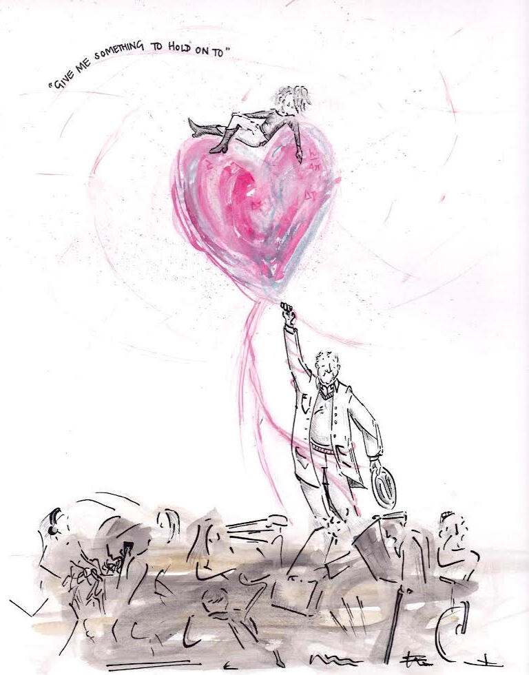 Having lived in London for 10 years, the grime of the streetcorner and the angular movement of the rush hour crowd were front and centre in my mind when creating this one. The 'love' that carries these two out of the hum drum and into something unexpected and new felt like it had to be in color.